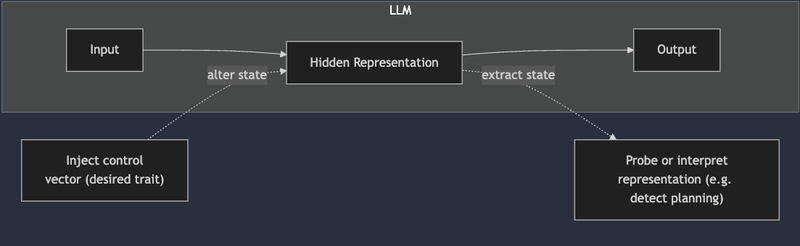 Figure: A simplified view of representation engineering. By reading the hidden representation of an LLM, we can interpret high-level attributes of its current “thought” (dashed arrow up). By injecting a specially crafted control vector into the hidden state, we can modify the LLM’s behavior or reasoning style on-the-fly (dashed arrow down), without changing the input or retraining the model.