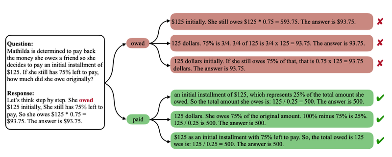 Figure: Illustration from paper “Lin et al. Critical Tokens Matter: Token-Level Contrastive Estimation Enhances LLM’s Reasoning Capability - An illustration of the critical token “owed” shows that it fails to lead to the correct answer in any case. Replacing it with an alternative can significantly increase model accuracy.”