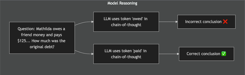 Researchers first noticed that forcing an LLM to avoid certain tokens can dramatically improve its reasoning outcomes. Lin et al. (2024) formalized this in Critical Tokens Matter, using mathematical problem solving as a testbed. They found that when an LLM’s chain-of-thought includes a critical token associated with a faulty reasoning pattern, the model often reaches an incorrect conclusion [1][6]. If the model is instead made to generate an alternative token at that step, it is far more likely to arrive at the correct answer. In other words, these tokens act like tipping points in the reasoning process. A tangible example is the word “owed.” In one experiment, an LLM solving a finance word problem kept using “owed” in its reasoning and consistently produced the wrong answer. Simply rephrasing the problem to use “paid” in place of “owed” led the model to a correct solution. The figure below illustrates this effect: the token "owed" steers the reasoning down a wrong path, whereas "paid" points it in the right direction, yielding a correct answer.